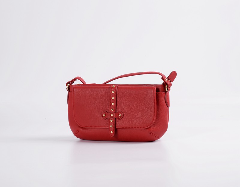 斜挎包,表面使用荔枝纹头层牛皮,搭配金色金属装饰,内里为提花棉布。